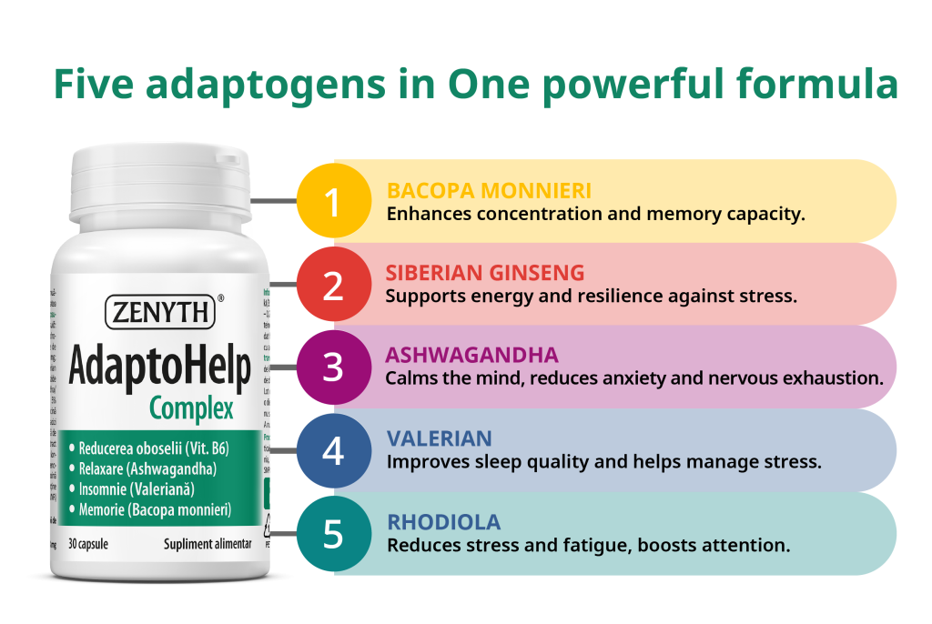 AdaptoHelp Complex is more than just a food supplement – it’s your daily ally for a more balanced, energized life. Combining the power of adaptogen plants such as Bacopa monnieri, Siberian ginseng, Ashwagandha, Valerian, and Rhodiola with essential vitamins (B6) and antioxidant minerals (selenium), this unique formula is designed to support your mind and body during demanding times. Whether you’re dealing with chronic stress, mental fatigue, or concentration difficulties, AdaptoHelp Complex offers the support you need.