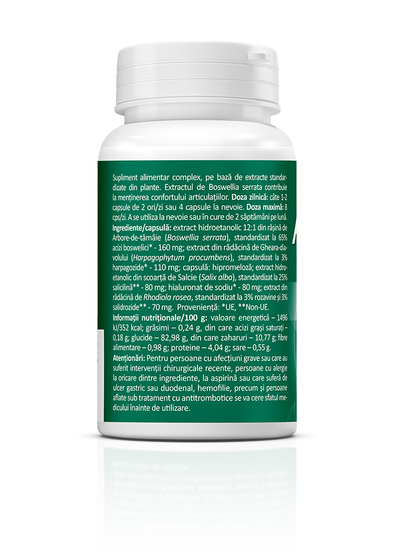 Ingredients per capsule: standardized extract with min. 65% boswellic acids from Boswellia serrata resin – 160 mg; vegetable capsule: hypromellose; standardized extract with min. 2.5% harpagosides from Devil’s Claw root (Harpagophytum procumbens) – 110 mg; standardized extract with min. 25% salicin from White Willow bark (Salix alba) – 80 mg; sodium hyaluronate – 80 mg; standardized extract with min. 3% rosavins and 3% salidrosides from Rhodiola root (Rhodiola rosea) – 70 mg.