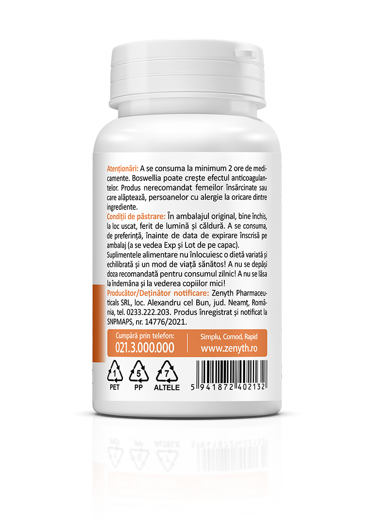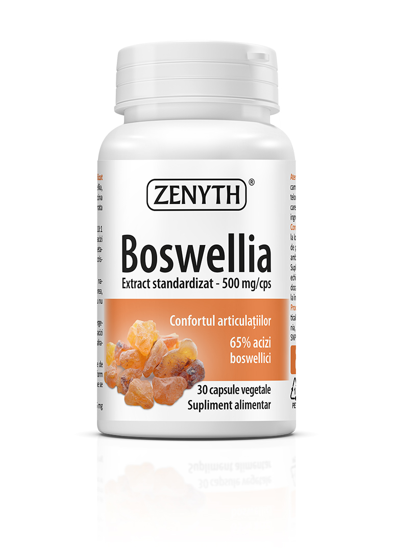 The active compounds in this plant are boswellic acids. Zenyth Boswellia contains a standardized extract with 65% boswellic acids. The main benefits of Boswellia include reducing inflammation and supporting the immune system. Studies have shown that Boswellia extract standardized in boswellic acids has anti-inflammatory effects comparable to non-steroidal anti-inflammatory drugs (NSAIDs). The extract appears to reduce inflammation and boost immunity by modulating the production of pro-inflammatory cytokines.