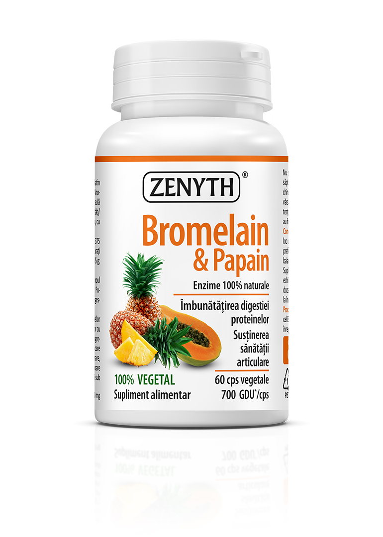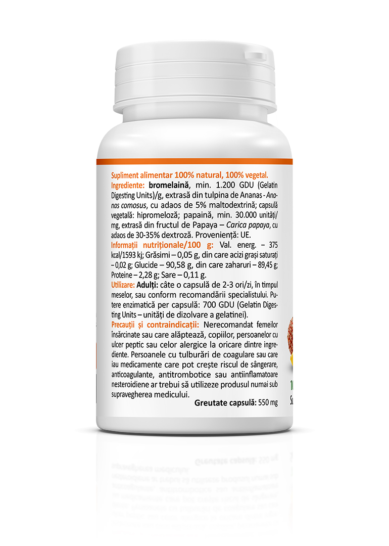 Bromelain & Papain is a 100% natural and 100% plant-based food supplement recommended for supporting protein digestion and absorption, as well as joint health. It also helps protect cells against oxidative stress and supports faster recovery after intense physical effort, as well as tissue recovery following post-operative or post-traumatic injuries.