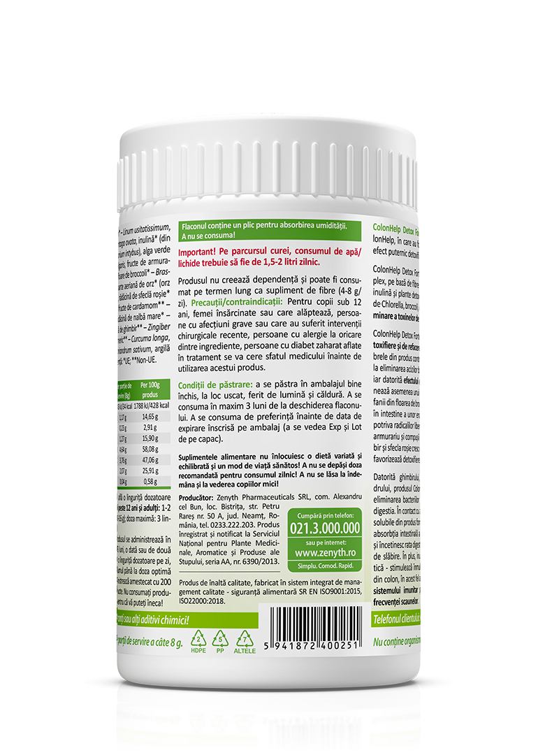 Milk thistle, green algae Chlorella, broccoli, green barley, red beetroot, ginger, and turmeric work synergistically with fibers, enhancing their detoxifying action and making ColonHelp. Detox Forte an advanced detox solution: