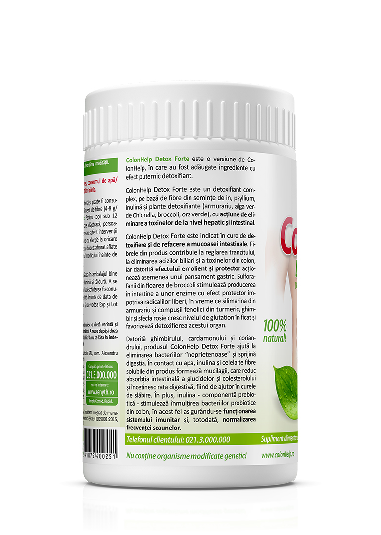 ColonHelp Detox Forte is an enhanced version of ColonHelp enriched with powerful detoxifying ingredients (milk thistle, green algae Chlorella, broccoli, green barley), designed to support the elimination of toxins at both hepatic and intestinal levels.