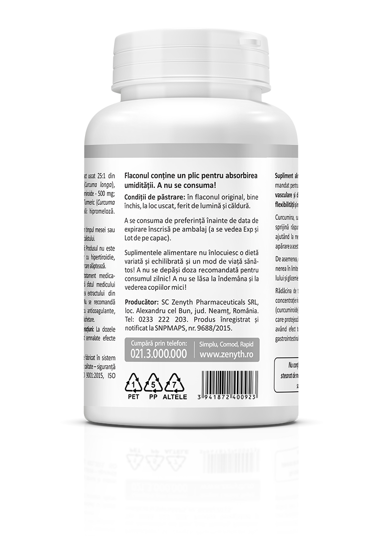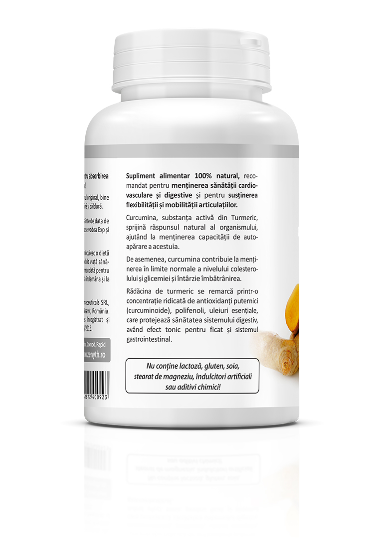 • Dry extract 25:1 from Turmeric root (Curcuma longa), standardized to 95% curcuminoids – 500 mg.