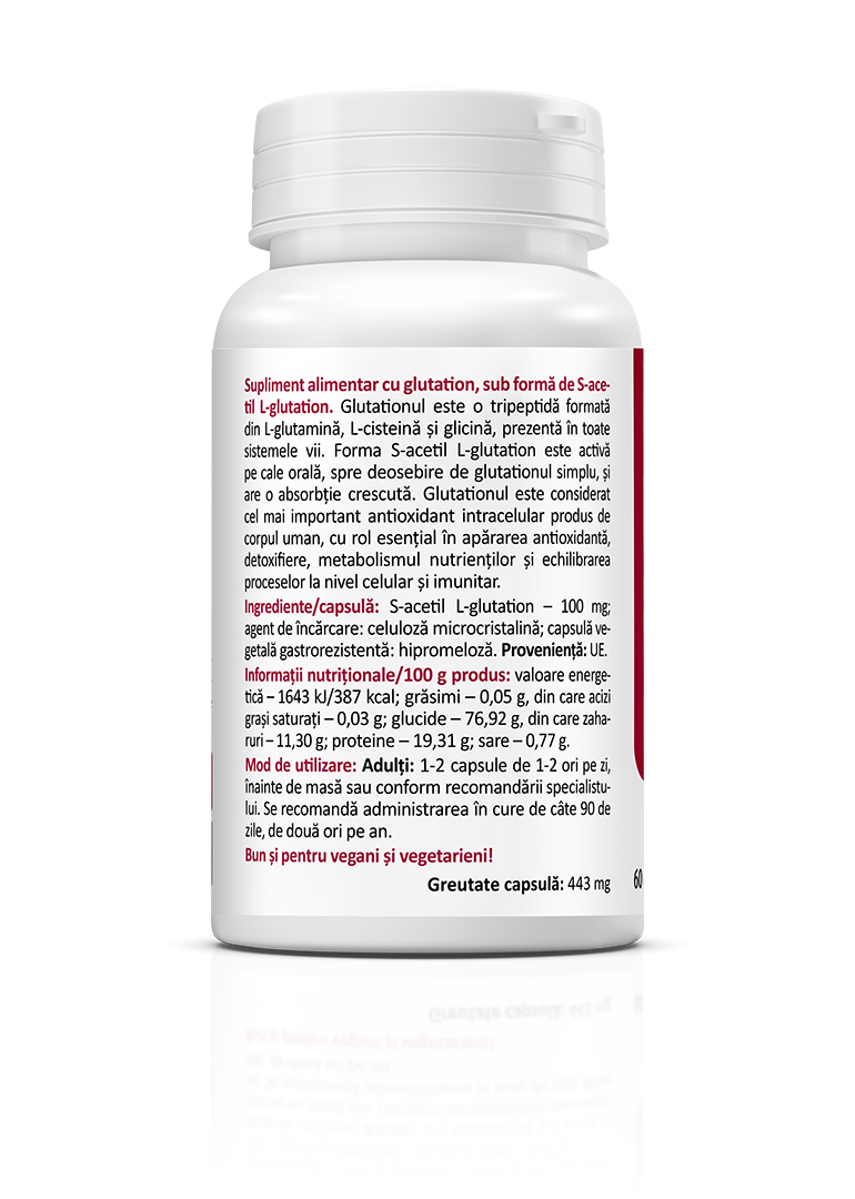 Glutathione is a food supplement with S-acetyl L-glutathione, 100 mg per capsule. The acetyl group helps protect the glutathione molecule and facilitates crossing the blood-brain barrier, allowing it to detoxify directly and protect the brain. S-acetyl L-glutathione can penetrate the mitochondrial membrane, helping maintain mitochondrial integrity and functionality.
