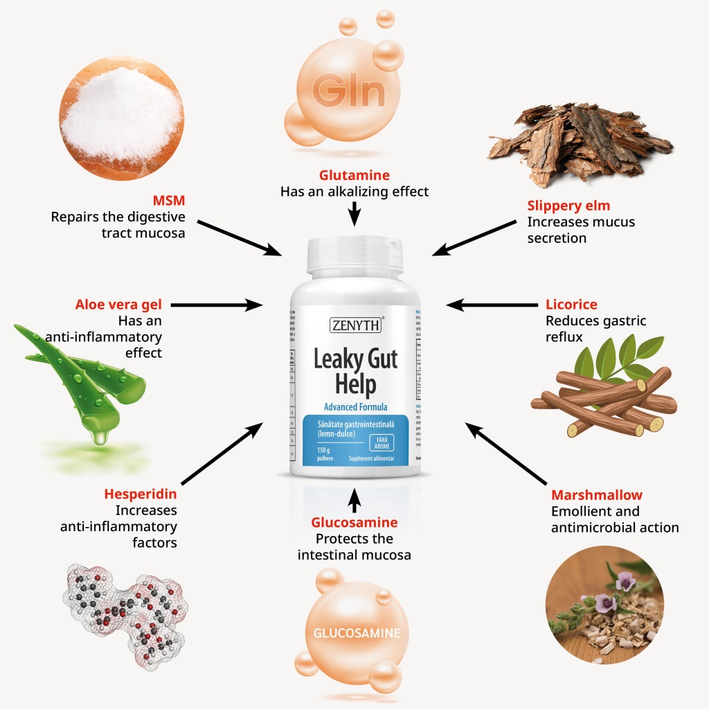 Leaky Gut Help is a dietary supplement based on a complex formula containing glutamine, glucosamine, licorice, aloe vera gel, slippery elm, MSM, marshmallow, and hesperidin. All these ingredients act synergistically and have anti-inflammatory, anti-ulcer, soothing, epithelial-repairing, and healing properties.
