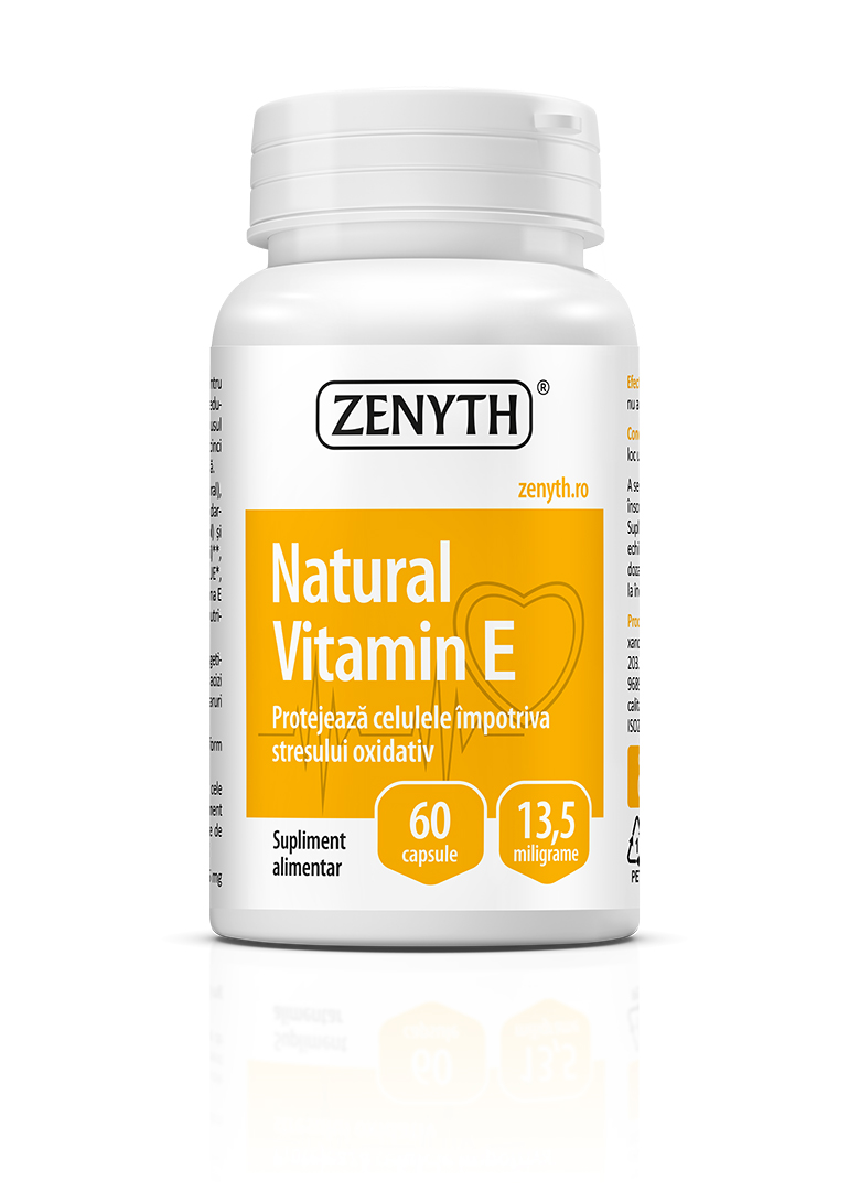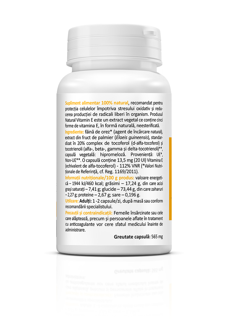 Natural Vitamin E is a 100% natural dietary supplement recommended for protecting cells against oxidative stress and reducing the production of free radicals in the body. Vitamin E helps maintain the proper functioning of intracellular organelles (mitochondria, lysosomes) and supports the stability and integrity of cell membranes. It plays a functional role in the muscular, nervous, and glandular systems, as well as in the aging process. Vitamin E is recommended for individuals with deficiencies, those working in toxic or polluted environments, situations that reduce the body’s natural defense capacity, or in cases of low-fat diets. You have surely heard about vitamin E and its well-known health benefits — antioxidant properties, protection of cells against harmful free radicals, and naturally slowing the aging process — but its benefits go even further.