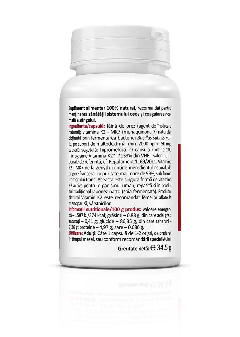 One capsule contains 100 micrograms of Vitamin K2*. (*133% NRV – Nutrient Reference Value, according to Regulation 1169/2011.)
