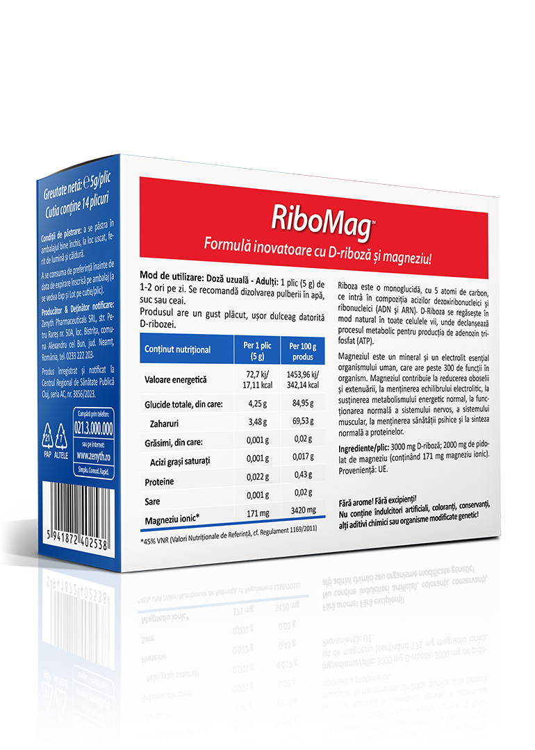 RiboMag is a dietary supplement that combines the benefits of D-ribose and magnesium pidolate to reduce fatigue and exhaustion, maintain electrolyte balance, and support normal energy metabolism. Both D-ribose and magnesium are nutrients recognized for their importance in cellular energy production and beyond. By combining them—two ingredients with a synergistic effect—the effectiveness of RiboMag is significantly increased, providing multiple benefits for overall health.