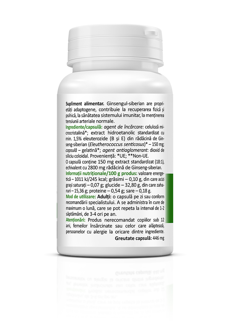 Siberian Ginseng is a food supplement with adaptogenic, revitalizing, and tonic properties. Also known as Eleutherococcus, Siberian Ginseng supports physical and mental recovery, promotes immune system health, and helps maintain normal blood pressure. It is also effective in supporting cognitive and mental performance, adrenal gland function, liver metabolism, and in increasing energy and resilience against stress and pollution. Several studies have shown that Siberian Ginseng may help alleviate symptoms of angina pectoris and reduce blood cholesterol and triglyceride levels. According to the same research, it helps relax arterial walls, thereby supporting healthy blood pressure levels.