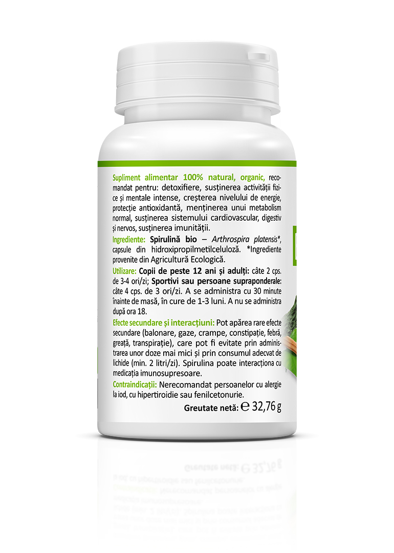 A 100% natural, organic food supplement recommended for detoxification, supporting intense physical and mental activity, increasing energy levels, providing antioxidant protection, maintaining normal metabolism, supporting the health of the cardiovascular, digestive, and nervous systems, and strengthening immunity. Spirulina contains chlorophyll, carotenoids, phycocyanin, minerals (iron, potassium, sodium, calcium, phosphorus, magnesium, zinc, selenium), vitamins (B, E, K), fatty acids (gamma-linolenic acid), and the enzyme superoxide dismutase. Thanks to its rich composition, Spirulina offers numerous health benefits: