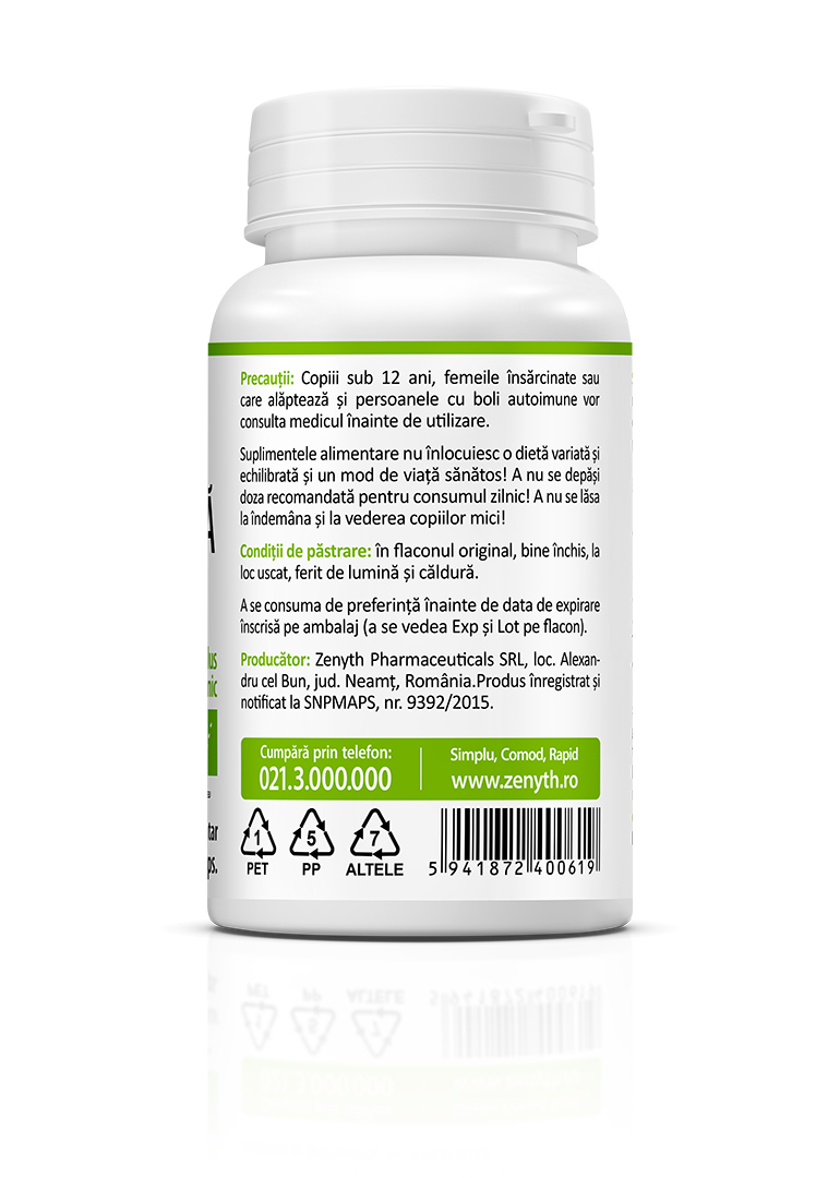 Precautions: Children under 12 years, pregnant or breastfeeding women, and individuals with autoimmune diseases or acute conditions should consult a healthcare professional before use. Food supplements should not replace a varied and balanced diet or a healthy lifestyle. Do not exceed the recommended daily dose. Keep out of reach and sight of young children.