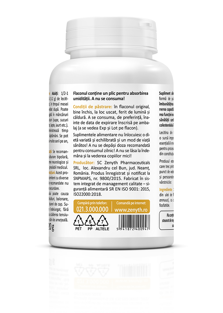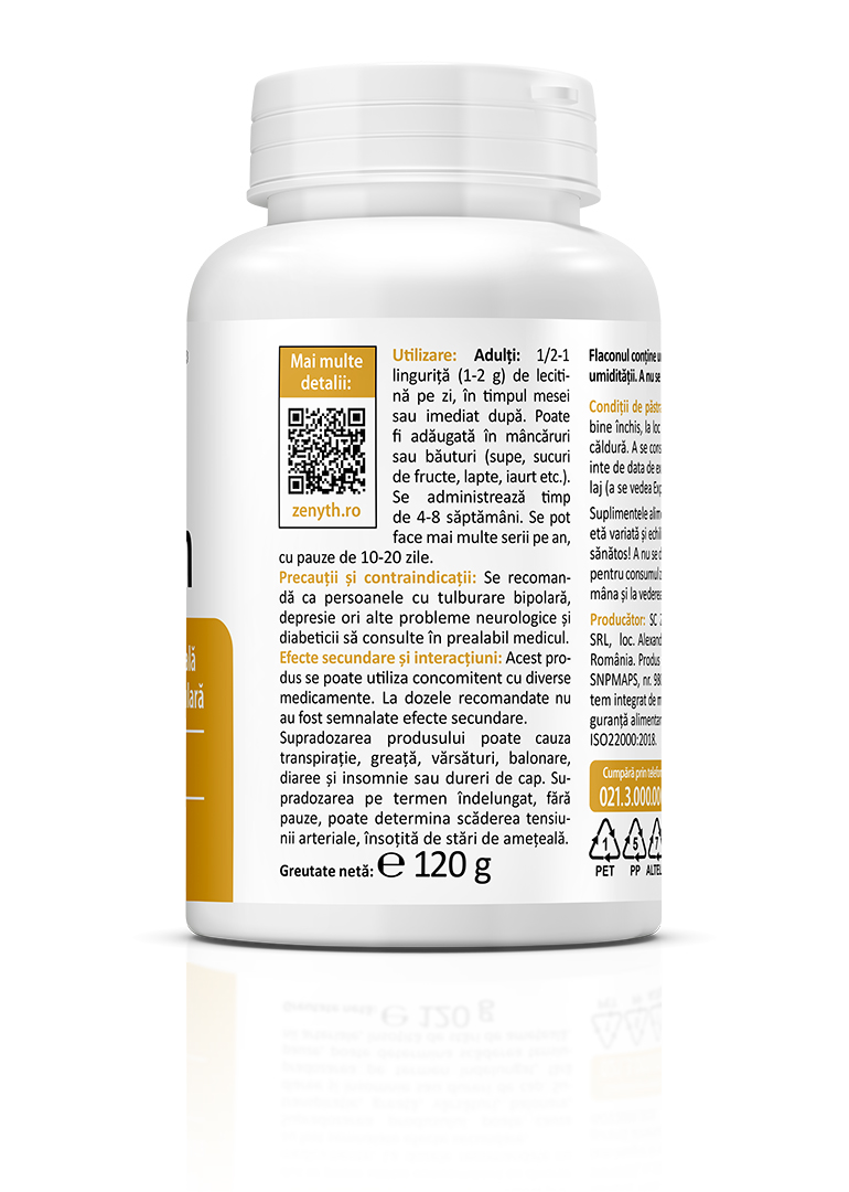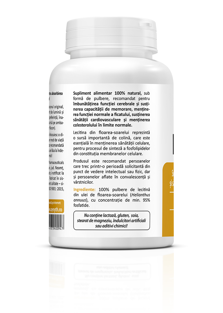 Sun Flower Lecithin is a 100% natural food supplement, in powder form, recommended for improving brain function and supporting memory capacity, maintaining normal liver function, supporting cardiovascular health, and helping keep cholesterol levels within normal limits. You may already know that sunflower lecithin is widely used in processed foods as a natural emulsifier, helping stabilize mixtures and maintain consistency. What you may not know is that sunflower lecithin can also be successfully used as a nutritional supplement due to its numerous health benefits. Sunflower lecithin is an important source of choline, essential for maintaining cellular health and for the synthesis of phospholipids that form cell membranes. The product is recommended for individuals going through periods of intense intellectual or physical effort, as well as for people in recovery and older adults. When taken during meals, sunflower lecithin may also help improve the absorption of fat-soluble vitamins such as vitamins A, D, E, and K.