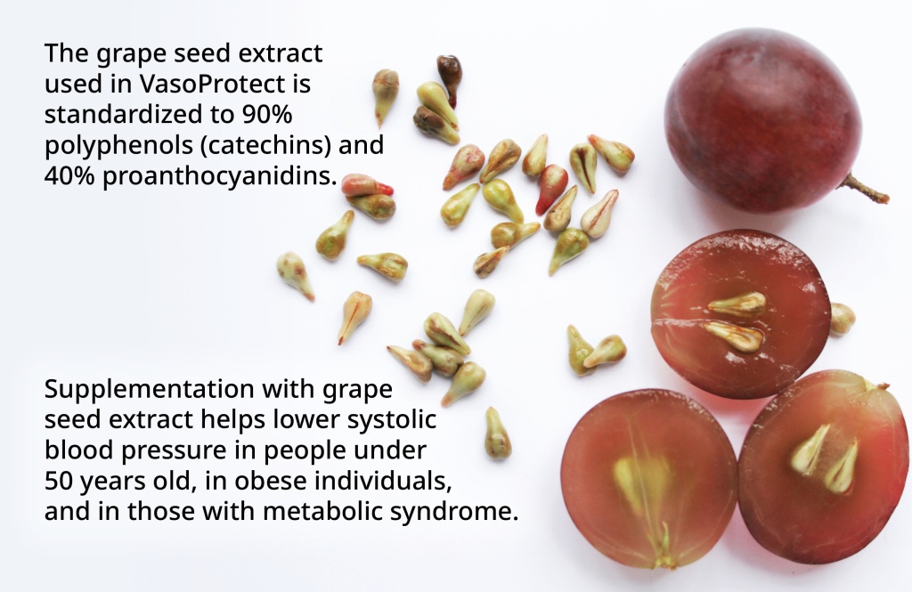 Polyphenols (catechins, proanthocyanidins) from grape seeds help reduce oxidative stress, have anti-inflammatory effects, provide cardiovascular and eye protection, regulate general lipid metabolism, support the immune system, and offer protection in diabetes and for the digestive tract. Proanthocyanidins not only have an antioxidant capacity 20 times greater than vitamin E and 50 times greater than vitamin C, but they also have strong anticoagulant and antiplatelet properties. It appears that supplementation with grape seed extract helps significantly lower systolic blood pressure in people under 50 years old, in obese individuals, and in those with metabolic syndrome. The grape seed extract used in VasoProtect is standardized to 90% polyphenols (catechins) and 40% proanthocyanidins.