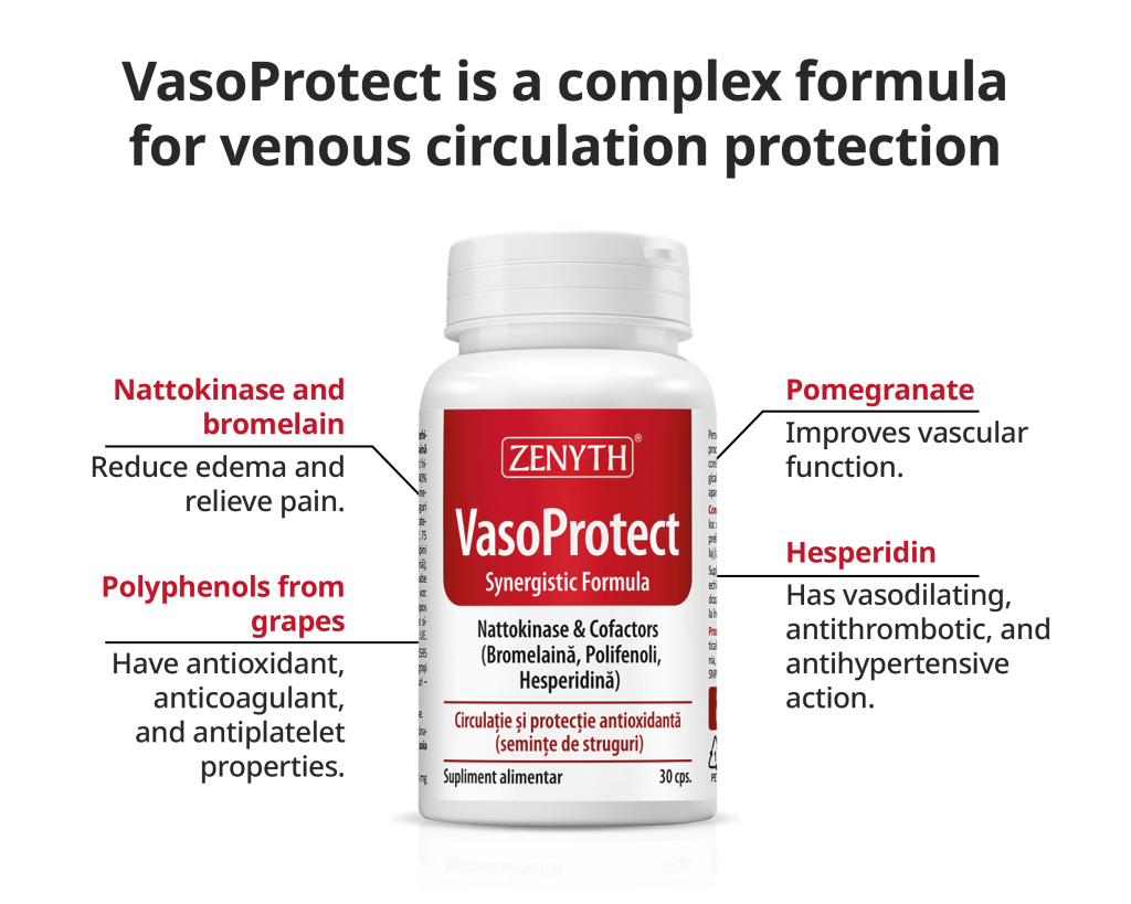 VasoProtect is a synergistic formula combining polyphenols (punicalagins, catechins, bioflavonoids/hesperidin) and enzymes (bromelain and nattokinase) that ensures cardiovascular protection by reducing the risk of thrombus formation, restoring endothelial function and elasticity, reducing inflammation, and promoting efficient circulation at cardiovascular, pulmonary, cerebral, renal, hepatic, genital, ocular, and muscular levels. In other words, Zenyth’s VasoProtect helps maintain normal blood circulation and viscosity, and it can also be used as an adjunct in recovery after trauma or surgical interventions.