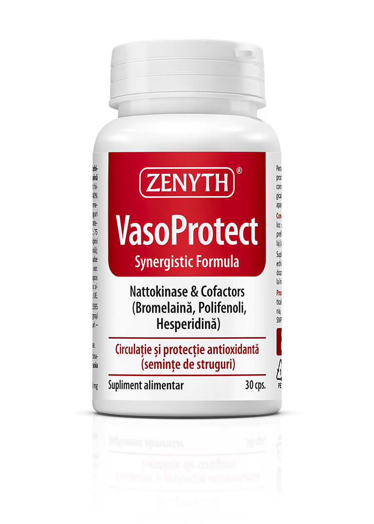 VasoProtect is a synergistic formula combining polyphenols (punicalagins, catechins, bioflavonoids/hesperidin) and enzymes (bromelain and nattokinase) that ensures cardiovascular protection by reducing the risk of thrombus formation, restoring endothelial function and elasticity, reducing inflammation, and promoting efficient circulation at cardiovascular, pulmonary, cerebral, renal, hepatic, genital, ocular, and muscular levels. In other words, Zenyth’s VasoProtect helps maintain normal blood circulation and viscosity, and it can also be used as an adjunct in recovery after trauma or surgical interventions.
