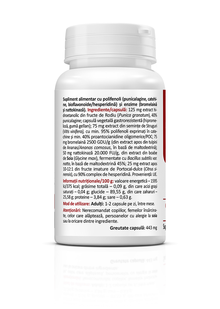 • 25 mg hydroethanolic extract 20:1 from pomegranate peel (Punica granatum), 40% punicalagins, in a base of maltodextrin and silicon dioxide.