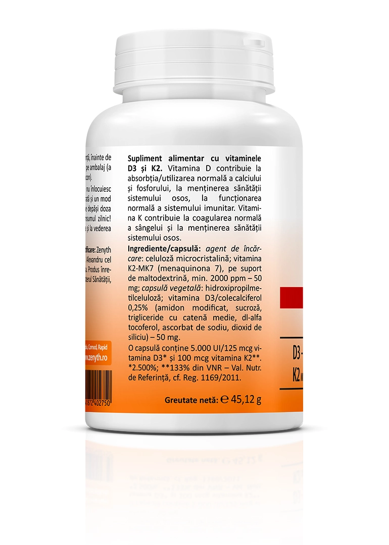 Each capsule provides 5000 IU D3 (2500% NRV*) and 100 mcg K2 (133% NRV*). (* Nutrient Reference Values according to EU Regulation 1169/2011)